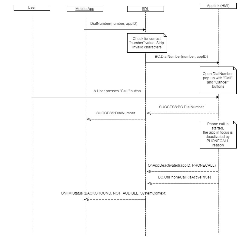 - Always respond to BC.DialNumber with a response code. If the HMI does not respond, the mobile application will never get a response from from SDL because default timeouts do not apply to the DailNumber mobile API.