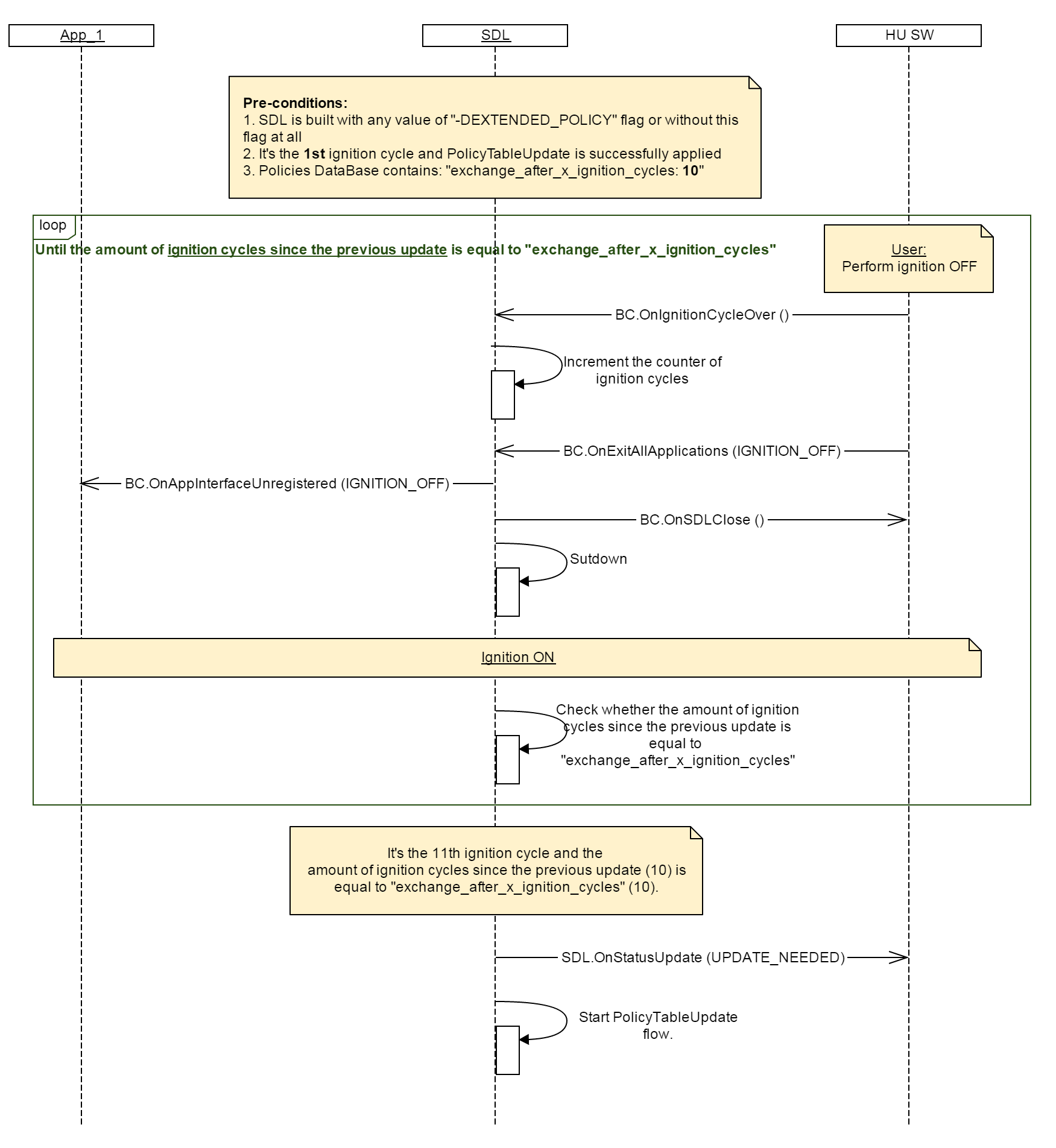 BC.OnIgnitionCycleOver dependencies:BC.OnIgnitionCycleOver only in case it's built with "-DEXTENDED_POLICY: ON" flag. Otherwise SDL needs BC.OnExitAllApplications(IGNITION_OFF) only.BC.OnIgnitionCycleOverSDL increments the "ignition_cycles_since_last_exchange" counter in Local Policies Table "ignition_cycles_since_last_exchange" gets equal to the value of "exchange_after_x_ignition_cycles", SDL triggers a Policy Table UpdateThis RPC has no additional parameter requirements