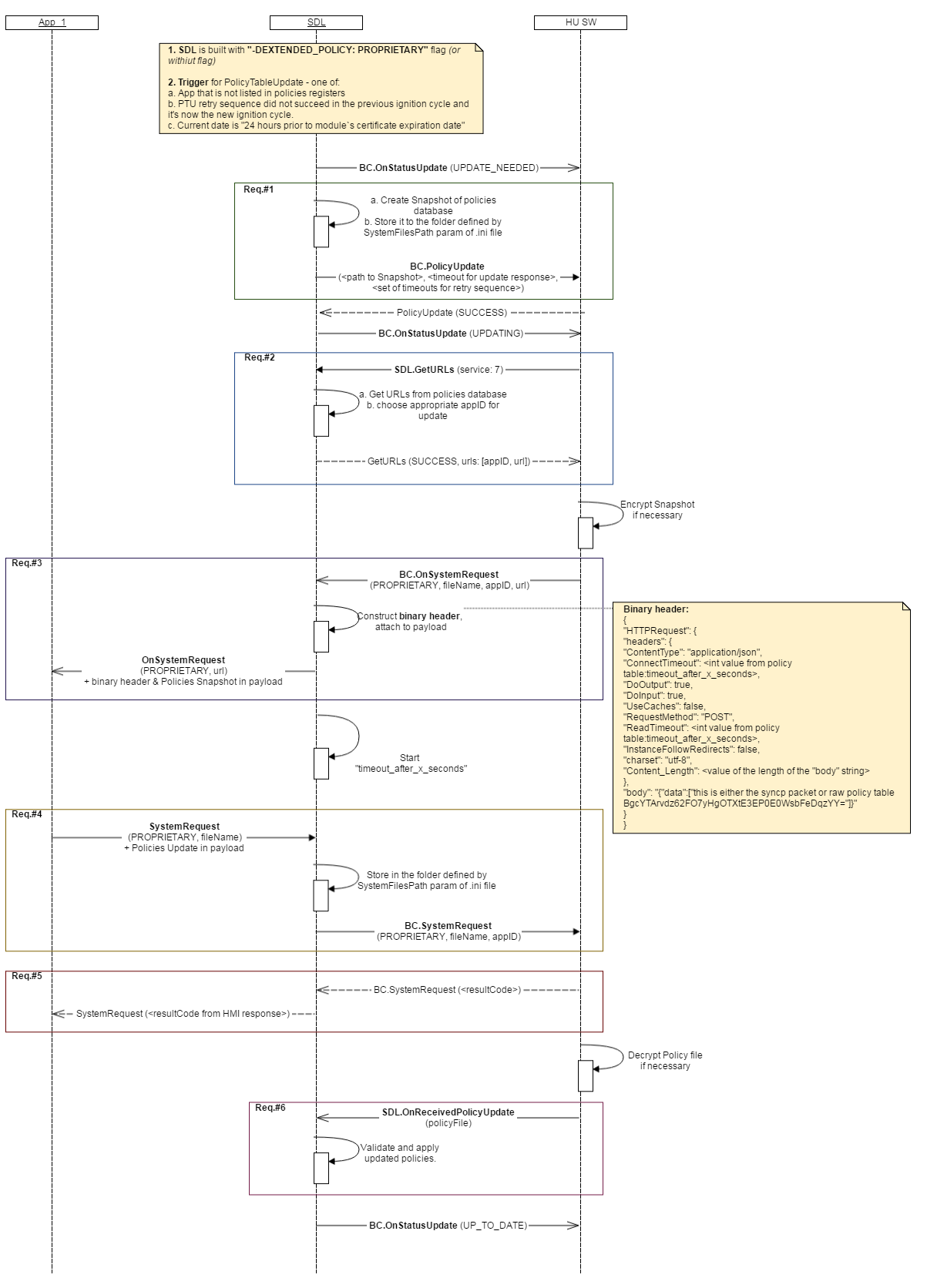 file parameter) in case and by the scheme required by Policies ServerSDL.GetURLs from SDLfile parameter in the next BC.OnSystemRequest that SDL will forward to mobile applicationSDL.OnStatusUpdate from SDL and display them in the appropriate UI menuBC.PolicyUpdate dependencies:BC.PolicyUpdate only in case it's built with "-DEXTENDED_POLICY: PROPRIETARY" flag or without this flag. Otherwise SDL handles the entire PTU flow by itself.BC.PolicyUpdate or responds with error, PTU sequence will not be continued. BC.PolicyUpdate (whichever comes first):"exchange_after_x_days" value in local PolicyTable (PT)"exchange_after_x_kilometers" value in local PT)"exchange_after_x_ignition_cycles" value in local PT)file - is the path to the Snapshot of local PolicyTable (Snapshot PT final destination is Policies Server)timeout - value taken from "timeout_after_x_seconds" field of local PTretry - array of values from "seconds_between_retries" field of local PT. SDL handles the PTU retry sequence (re-requesting update if fails to receive during timeout) by itself.| Name | Type | Mandatory | Additional | Description |