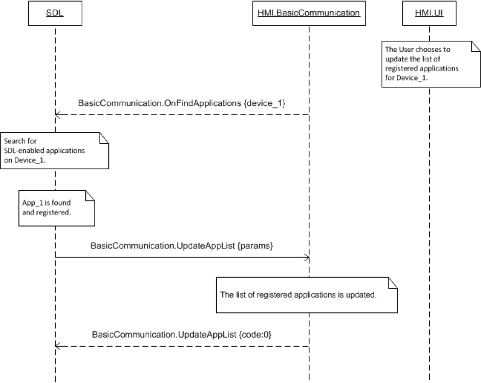 SDL may send this request after connecting to a device, and an application successfully registers itself with SDL. This request may also be sent by SDL if the user requests for an update via OnFindApplications.