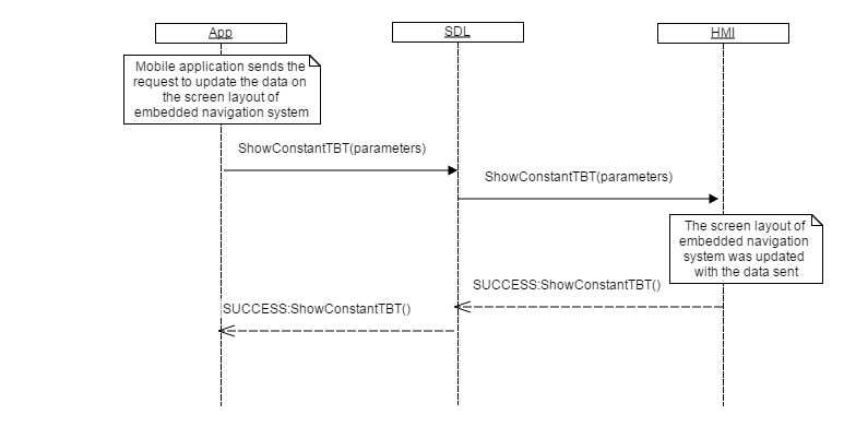 { "id" : 543, "jsonrpc" : "2.0", "method" : "Navigation.ShowConstantTBT", "params" : { "navigationTexts" : [ { "fieldName" : navigationText1, "fieldText" : "Destination point: Berlin" }, { "fieldName" : ETA, "fieldText" : "15:45" }, { "fieldName" : totalDistance, "fieldText" : "658" } ], "turnIcon" : [ "value" : "tmp/SDL/app/Navi/icon_3245.jpeg", "imageType" : DYNAMIC ], "distanceToManeuver" : 168, "distanceToManeuverScale" : 265, "softButtons" : [ "type" : TEXT, "text" : "Close", "softButtonID" : 76, "systemAction" : DEFAULT_ACTION ], "appID" : 26743 } }