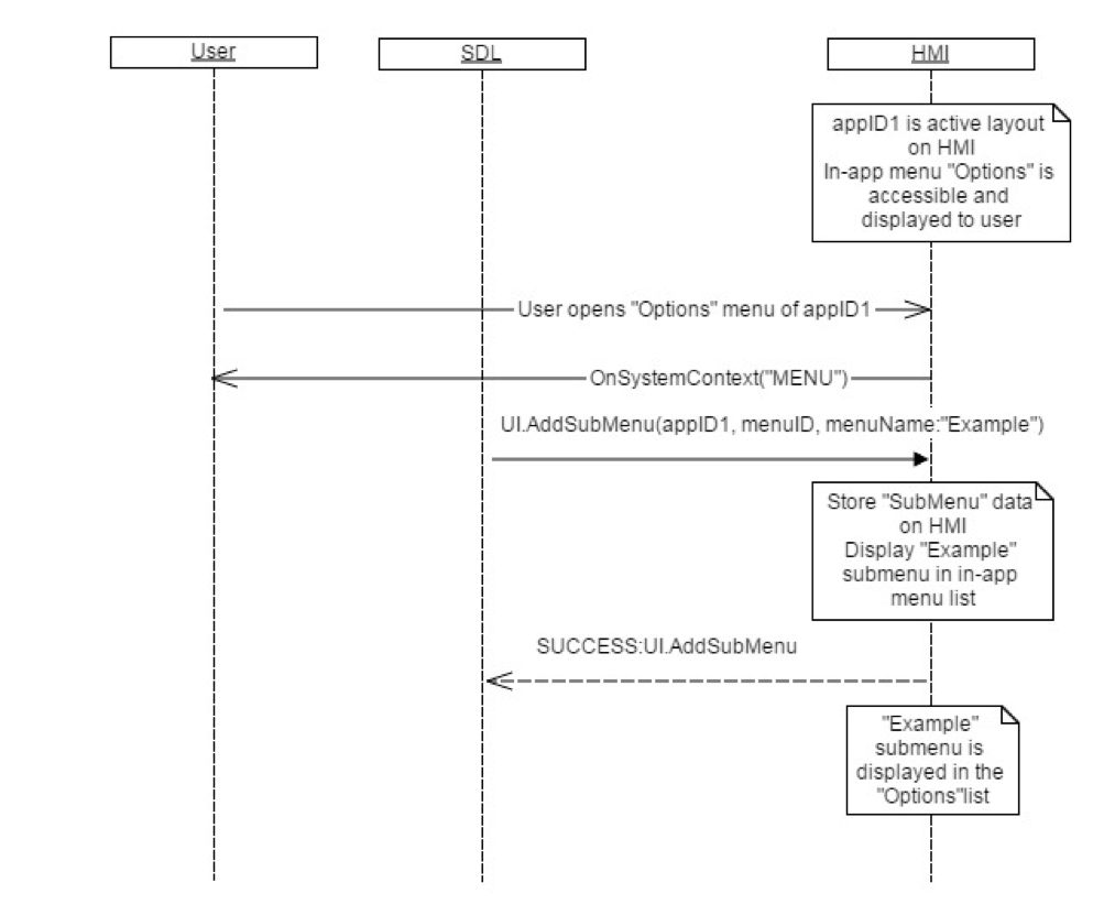 UI.AddSubMenu represents a request from an application to add a sub-menu to the application's menu. This RPC can be sent to the HMI for an application that is registered and in any state (FULL, BACKGROUND, etc.)