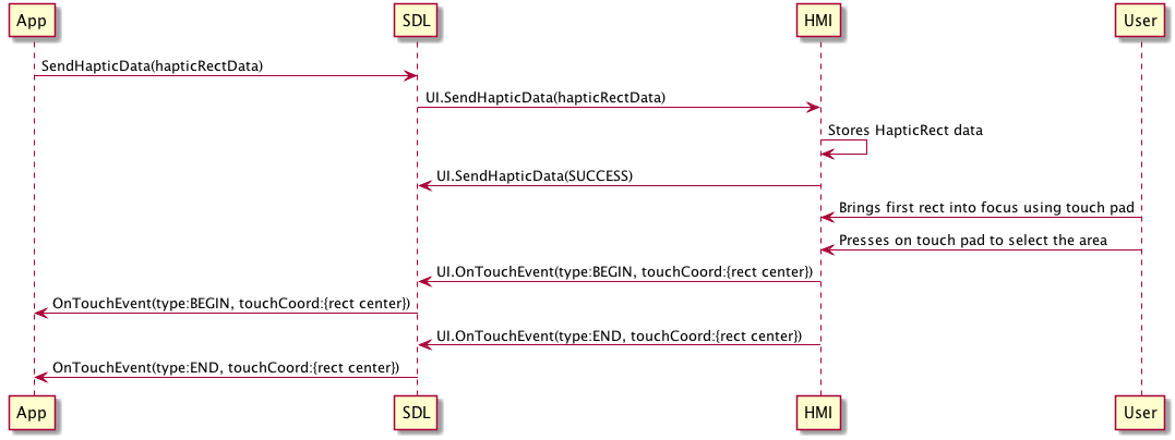 The HMI must send a pair UI.OnTouchEvent (one BEGIN and one END) with a TouchCoord corresponding to the center of the HapticRect when one of these elements is selected by the user.