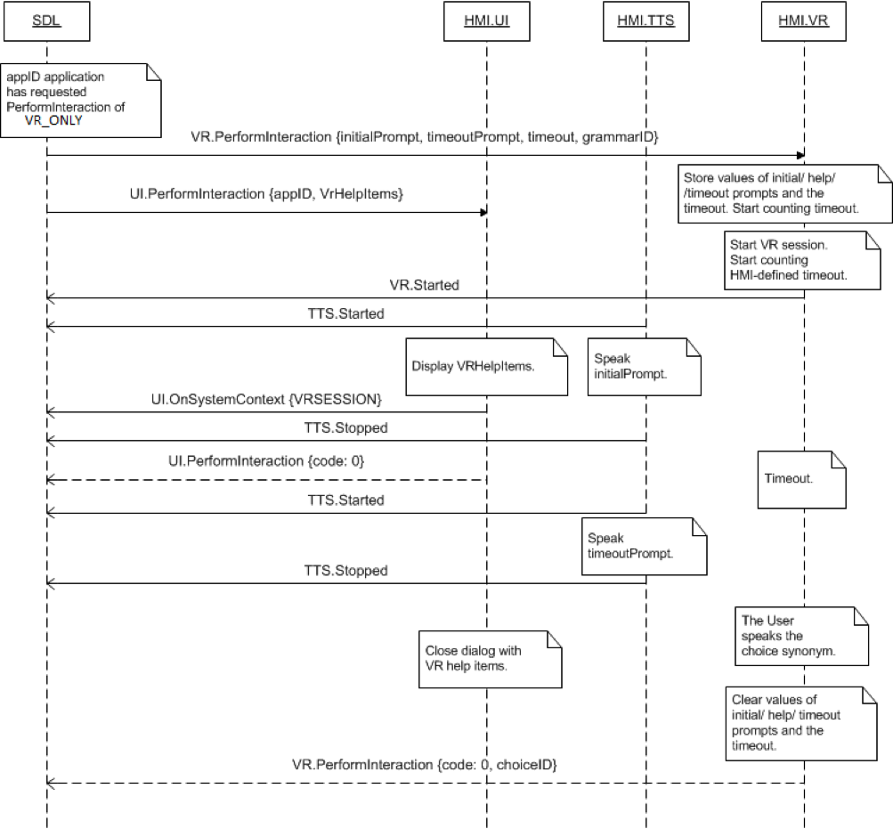 { "id" : 79, "jsonrpc" : "2.0", "method" : "VR.PerformInteraction", "params" : { "initialPrompt" : [ { "text" : "Please make your choice by voice", "type" : "TEXT" } ], "helpPrompt" : [ { "text" : "Yes", "type" : "TEXT" }, { "text" : "No", "type" : "TEXT" }, { "text" : "Skip", "type" : "TEXT" } ], "timeoutPrompt" : [ { "text" : "The time is about to run out", "type" : "TEXT" } ], "timeout" : 10000, "grammarID" : 245 } }
