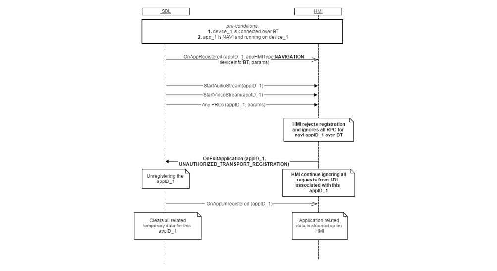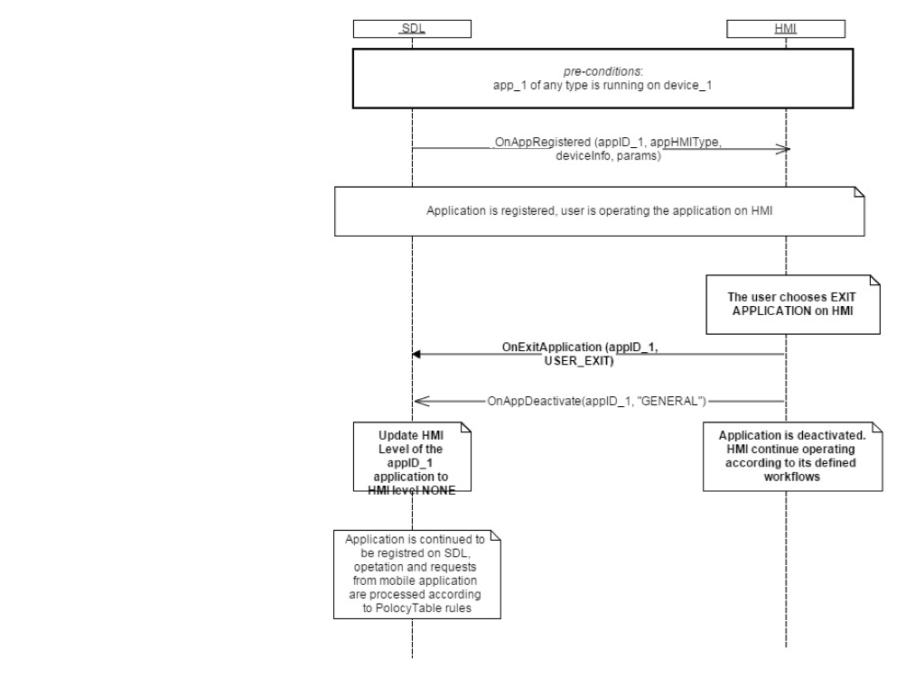 OnExitApplication notification to SDL if an application conflicts with any of the rules above (i.e. Users requests to exit, driver distraction rules violated, or navigation app connected over bluetooth).The HMI may switch layouts or views according to the workflow after deactivation of an application.