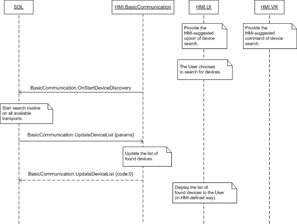 On receipt of this notification SDL starts searching for devices on all available transports. Afterwards, SDL provides the search results via UpdateDeviceList.
