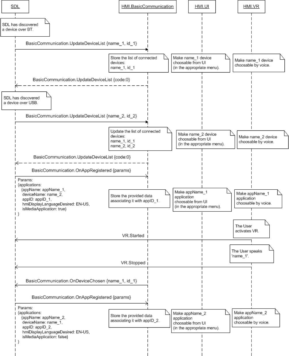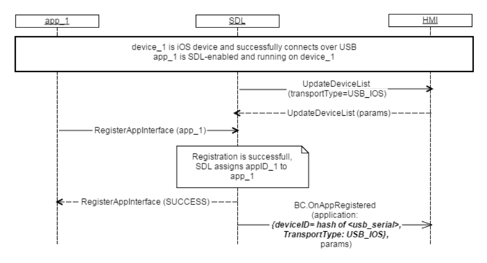 • SDL allows registration of applications on the named device and sends BasicCommunication.OnAppRegistered to the HMI