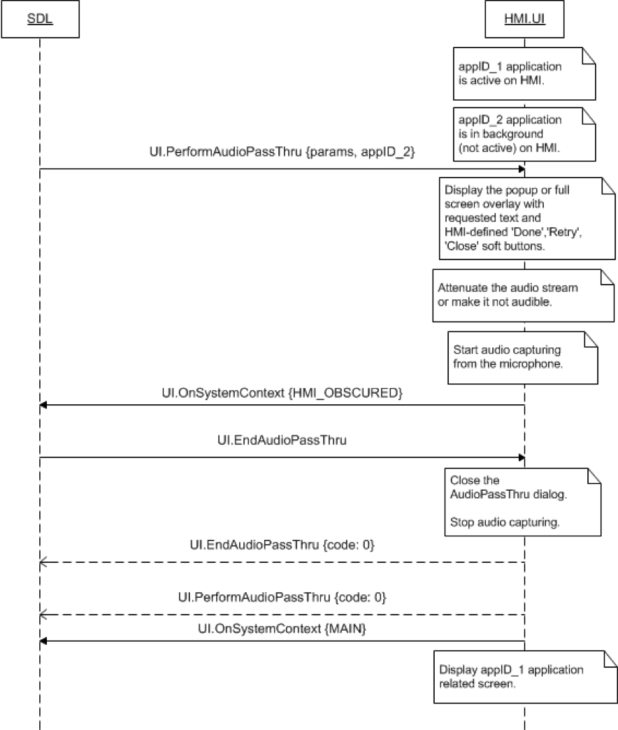 { "id" : 79, "jsonrpc" : "2.0", "method" : "UI.PerformAudioPassThru", "params" : { "audioPassThruDisplayTexts" : { "fieldName" : audioPassThruDisplayText1, "fieldText" : "The audio capturing is in progress" }, "maxDuration" : 10000, } }